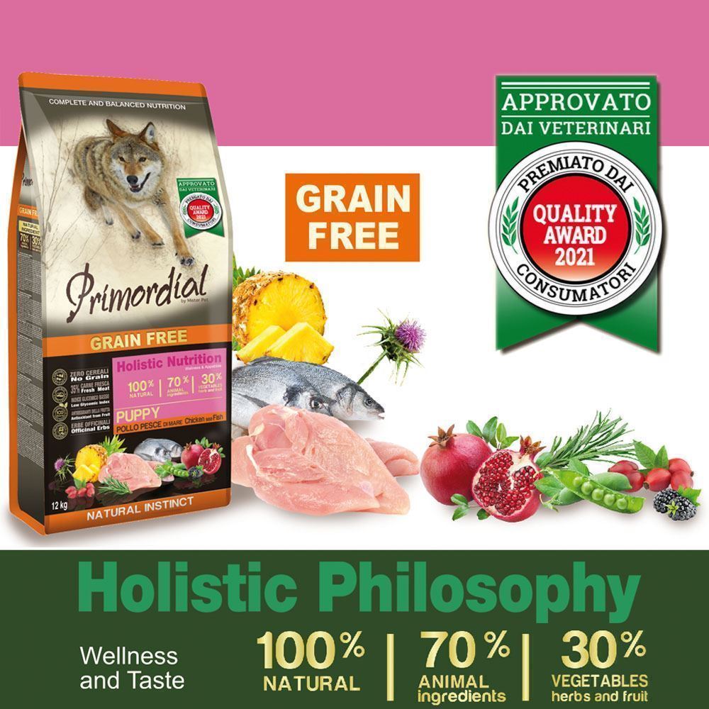Primordial grain free puppy pollo e pesce è un alimento completo privo di cereali ricco di proteine con alto valore biologico e con un'appropriato profilo aminoacido.