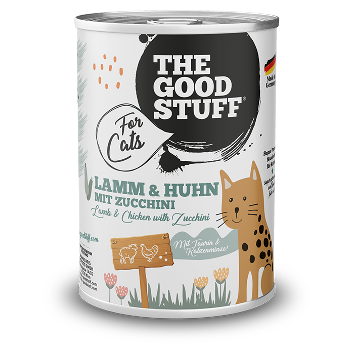 AGNELLO e POLLO con ZUCCHINE è un alimento umido senza cereali di comprovata qualità super premium di THE GOODSTUFF For Cats. L'elevata accettanza di THE GOODSTUFF For Cats è il risultato dell'utilizzo di materie prime di altissima qualità: l'agnello particolarmente saporito e il pollo altamente digeribile sono a basso contenuto di grassi e ricchi di preziose vitamine e nutrienti. Il nostro alimento umido per gatti è cotto delicatamente, contiene il 40% di carne fresca di muscolo di pollo e frattaglie di alta qualità provenienti da fornitori regionali, il 26% di agnello fresco, raffinato con verdure regionali, taurina ed erba gatta. AGNELLO e POLLO con ZUCCHINE è un alimento completo per gatti di tutte le razze e taglie.